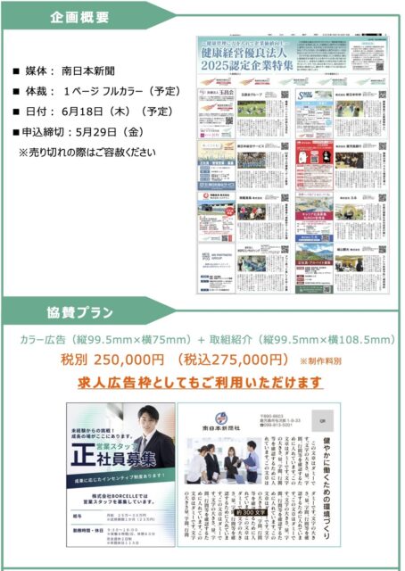 南日本新聞にて6/18(木)付で行う健康経営優良法人特集の広告企画です。