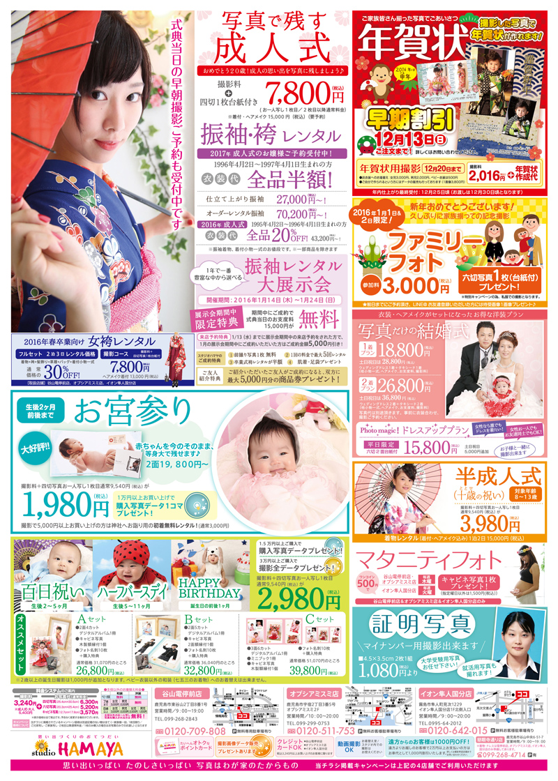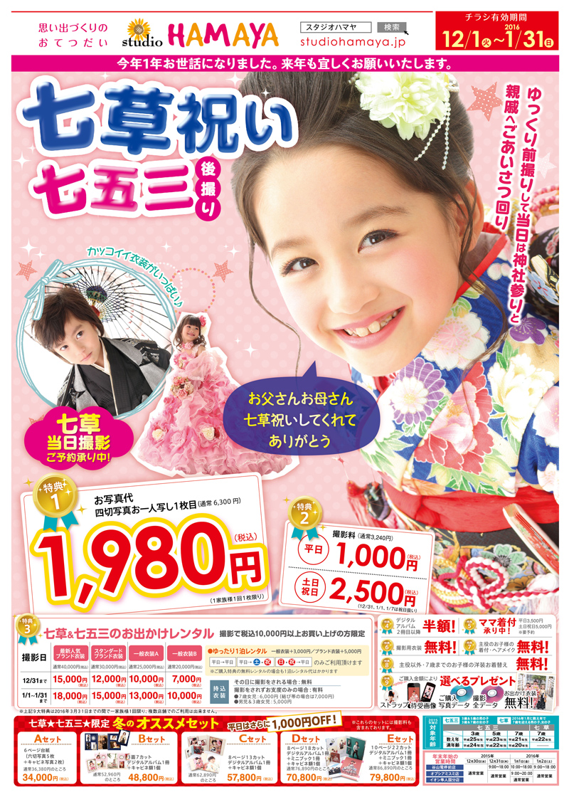 スタジオハマヤ様 AP 大石裕一郎 D 中辻ゆかり URL: http://studiohamaya.jp/ Tweet studio HAMAYA様の七草・七五三B4チラシを制作させていただきました。 こどもたちの素敵な笑顔の写真をメインにデザインしました。ピンク色をベースににぎやかで楽しい雰囲気に撮影したい!と思っていただけうようにデザインしました。